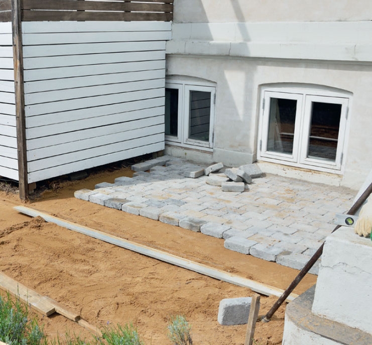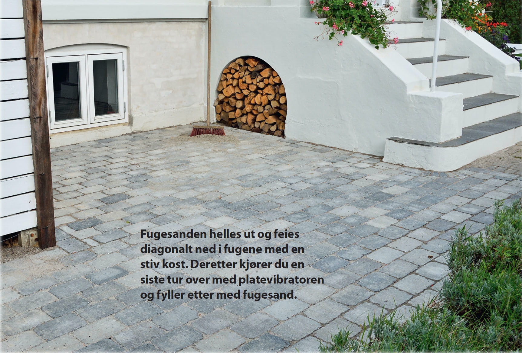 Oppå det hardstampede bærelaget fordeles et settelag på snaut 10 cm (det skal være tynnere under en innkjøring, som skal bære tyngre vekt). Du skal legge på så mye at det er nok til å trekke det av, slik at underlaget er helt rett før steinene legges. Her skal de også passe inn mot en belegning ved siden av. Sørg for å lage fall, så vannet ledes vekk fra huset.
