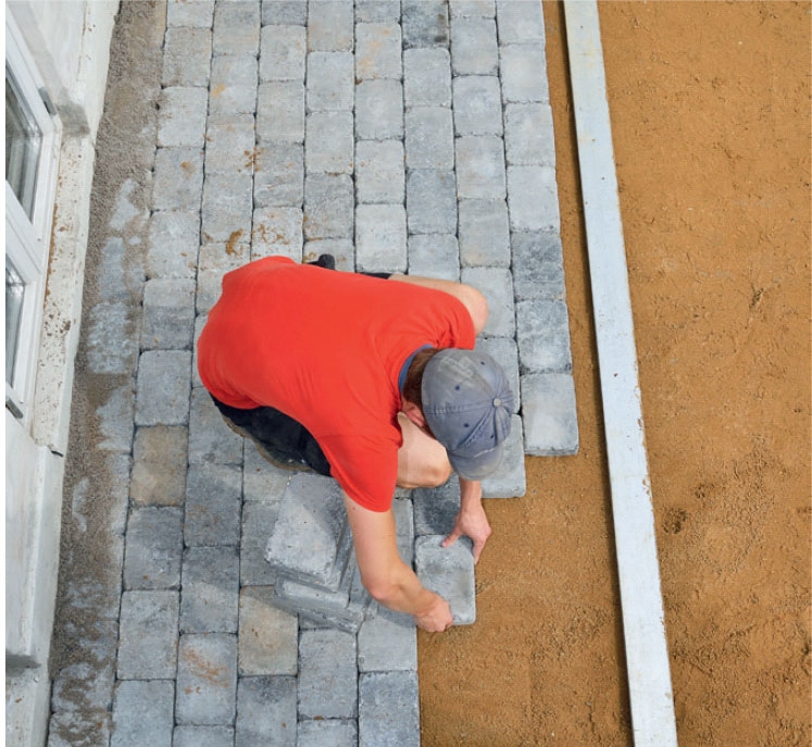 Steinene legges. Lag først en kant hele veien rundt, og legg de øvrige steinene forskjøvet i forhold til hverandre - i såkalt halvforband. Det går fort å legge steinene når underlaget er rettet opp.