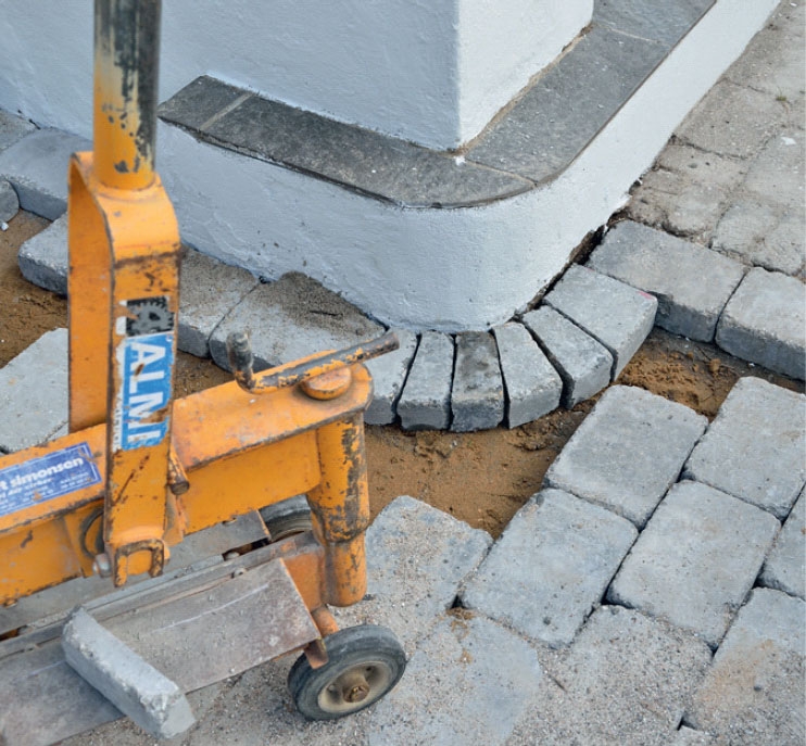Det nye underlaget bygges først opp med et 15 cm tykt bærelag, som komprimeres med en platevibrator. Det er den eneste større maskinen som blir brukt til dette prosjektet, men den er også nødvendig for å sikre at underlaget blir stampet så hardt som mulig.