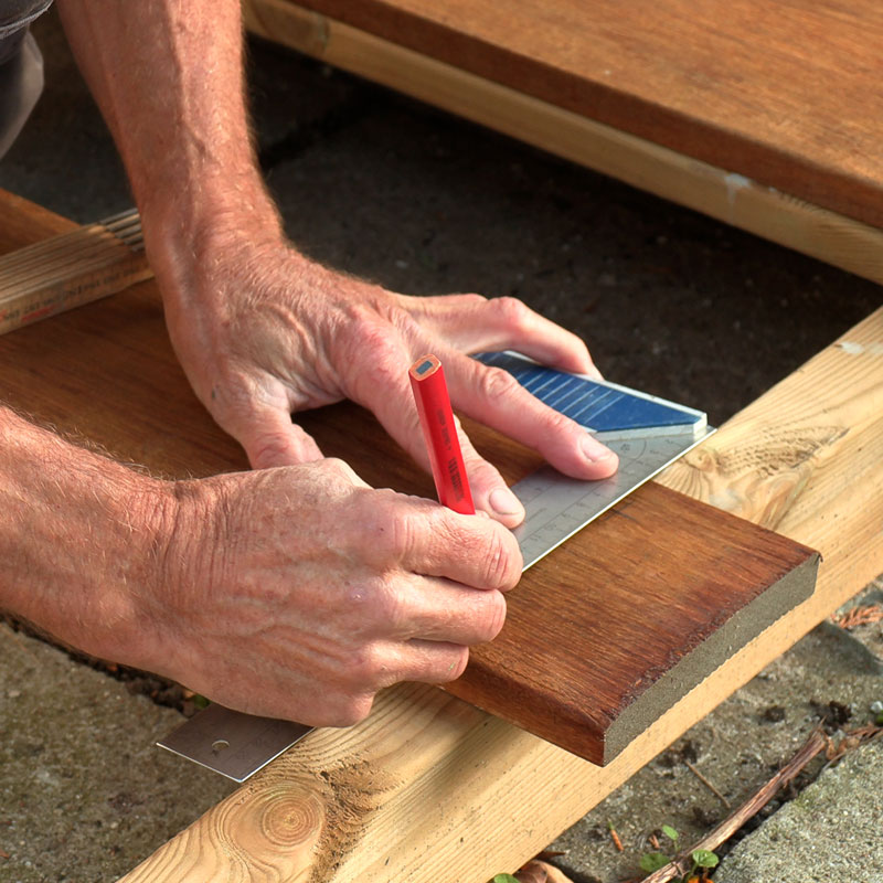 Skruene skal sitte på en rett linje. Det er viktig for sluttresultatet at skruer og propper sitter som perler på en snor. Derfor skal du streke opp på samtlige bord, slik at du kan bore hull i en snorett rekke.