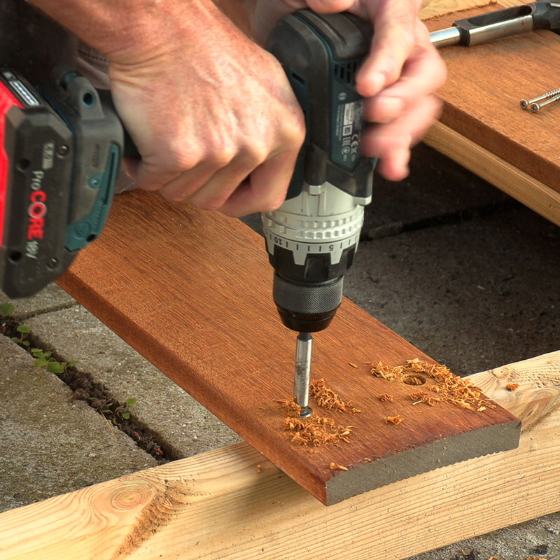 Det første du skal gjøre er å bore en snorrett rekke hull med et 8 mm sylinderbor der du skal skru. Bor bare halvveis gjennom bordene. Deretter skrur du fast terrassebordene i hullene.