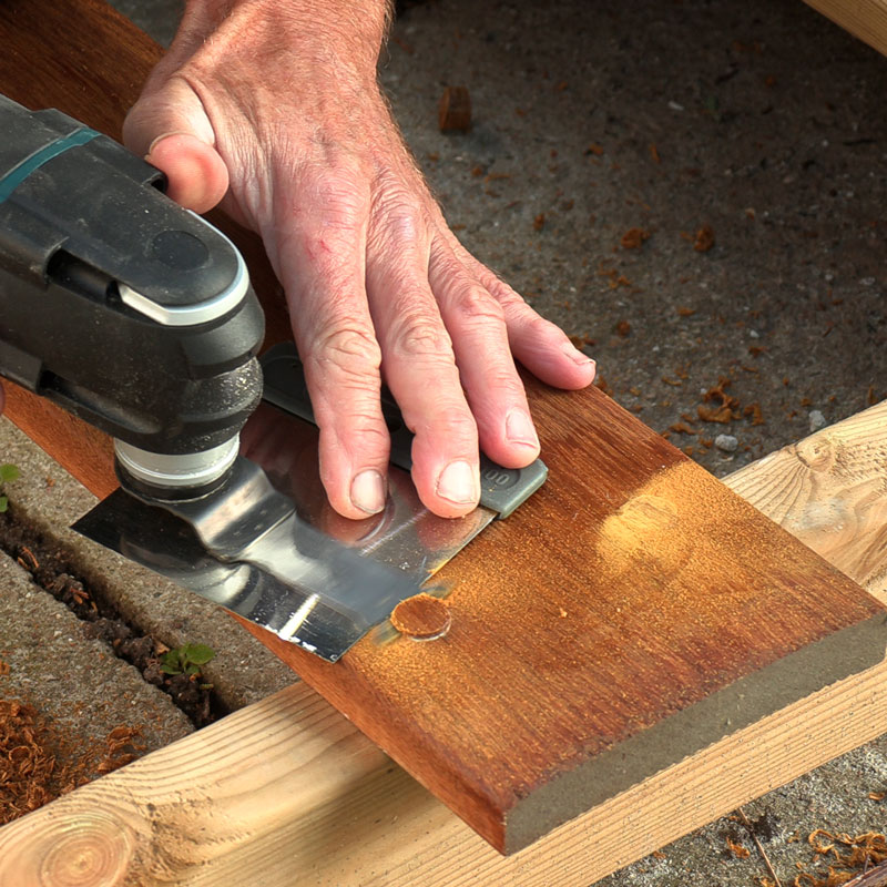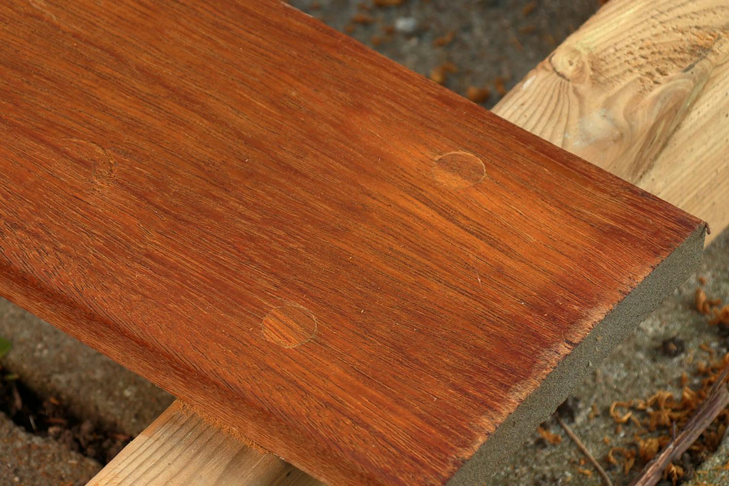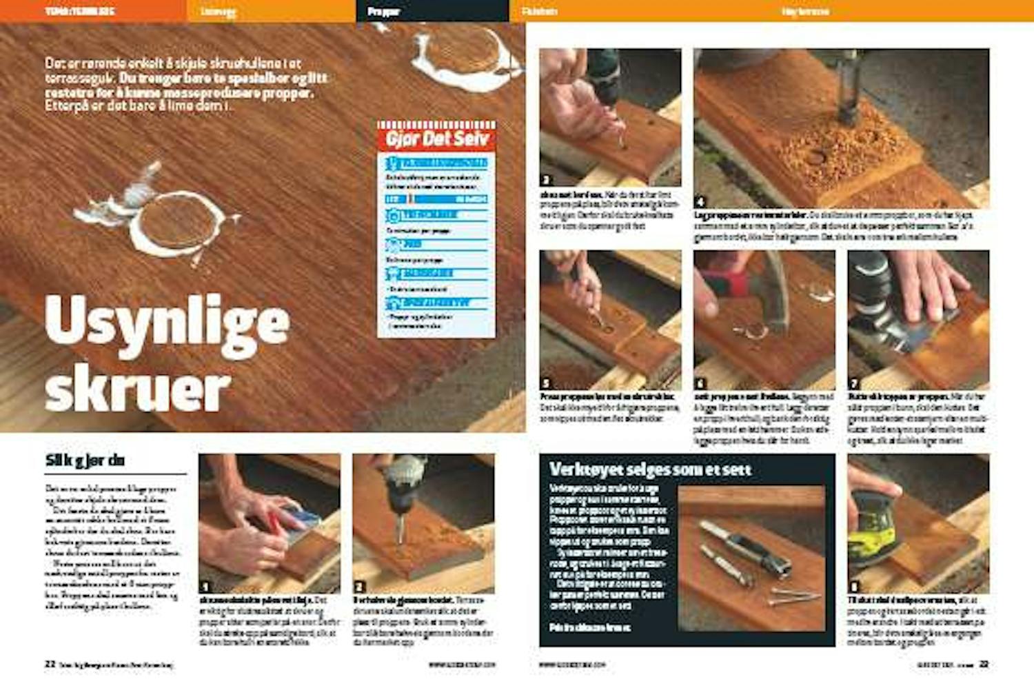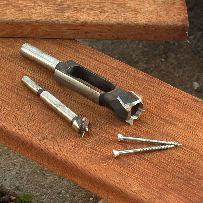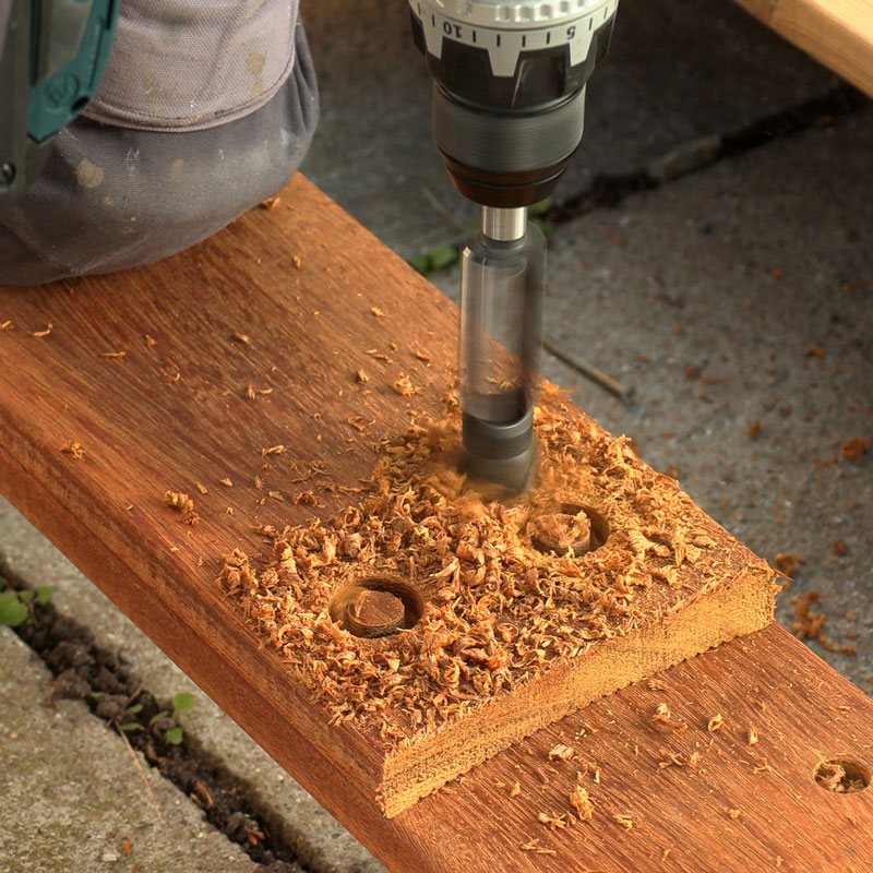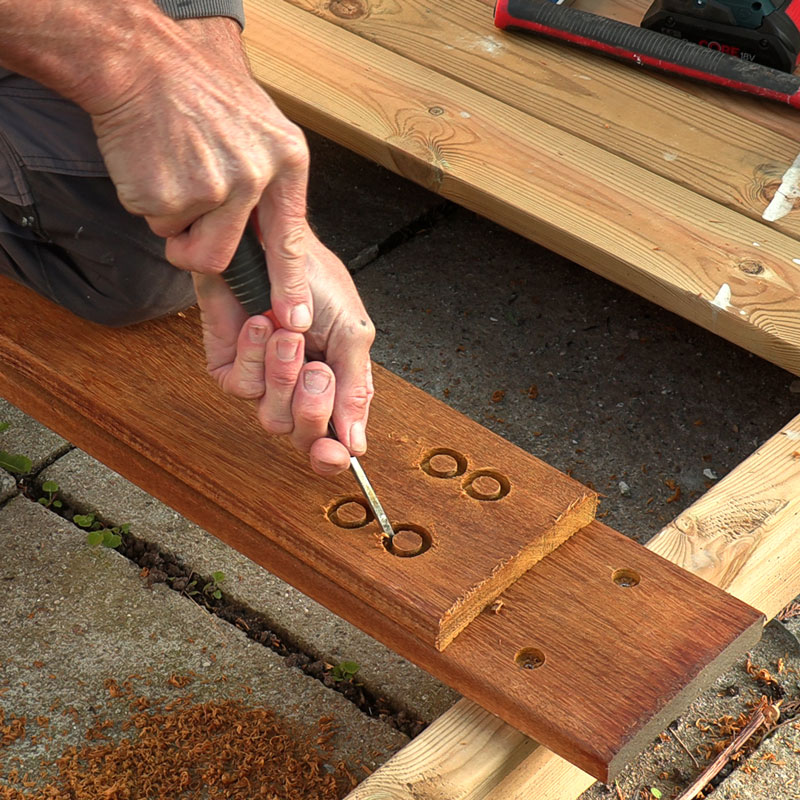 Neste prosess er å bore ut det nødvendige antall propper fra rester av terrassebordene med et 8 mm proppbor. Proppene skal smøres med lim og slås forsiktig på plass i hullene.