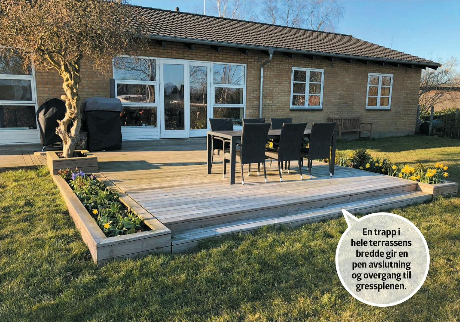 Trinnet er bygget som en del av terrassen, slik at ytterkanten av trinnet flukter med endene på bedene.