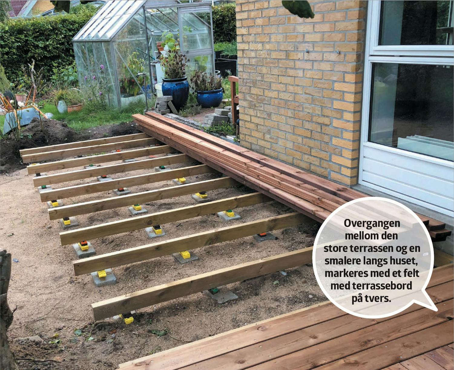 På denne terrassen legges det et felt med fem tverrgående bord som overgang mellom den store terrassen og en mindre terrassedel lang husveggen. Du kan også velge å legge bare et enkelt bord på tvers, og deretter gjøre det flere steder på en stor terrasse, slik at den blir oppdelt flere felt.