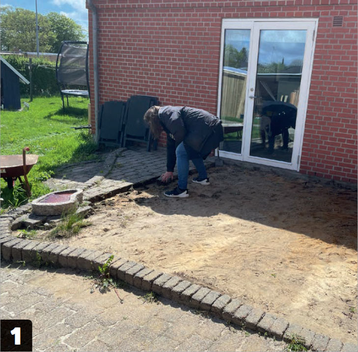 Fiskebeinsterrassen skal erstatte en gammel steinbelegning. Under den gamle belegningen heller underlaget litt ved husveggen, og betraktelig mer litt lenger ut fra den.