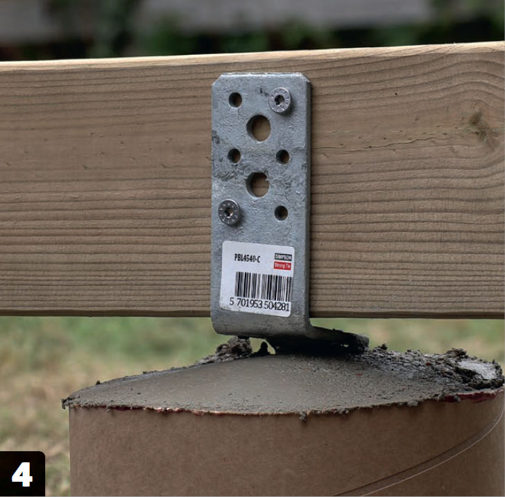 Forleng bjelkene. Der bjelkene ikke er lange nok, skal de forlenges. Forlengerne skjøtes på med beslag og skruer, og hviler på faststøpte stolpesko.