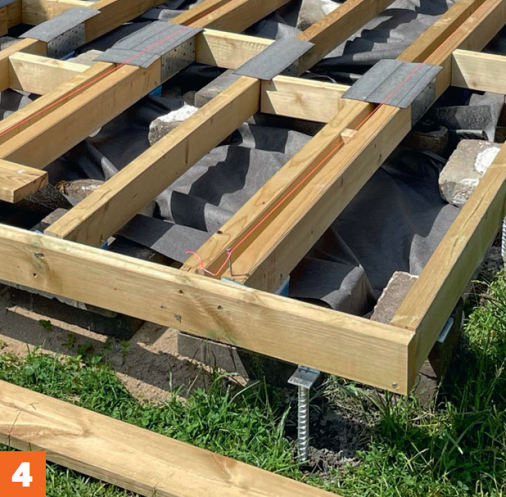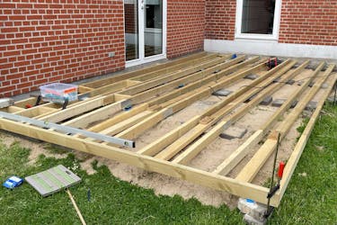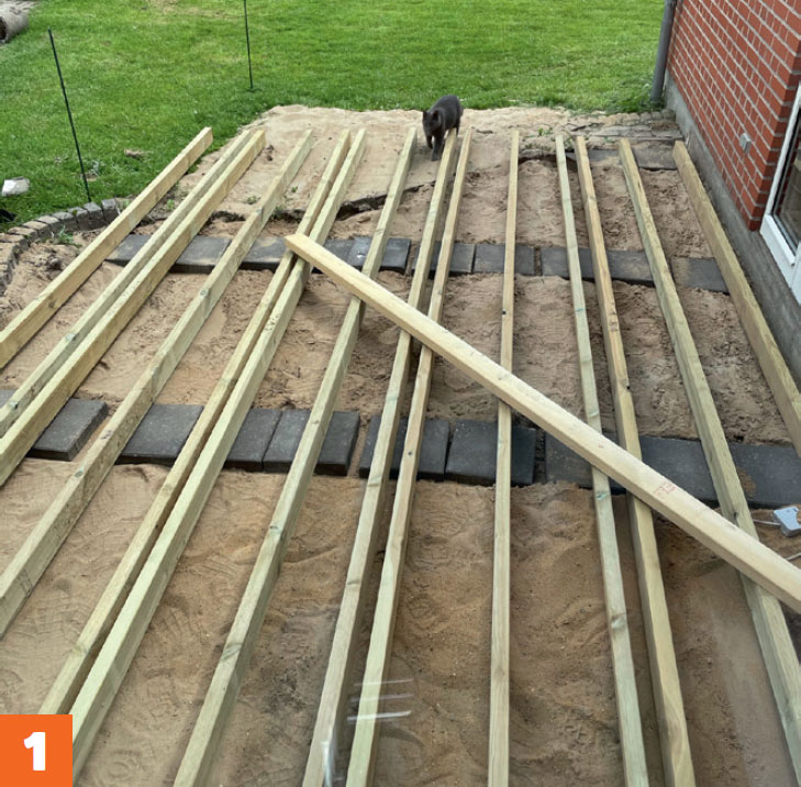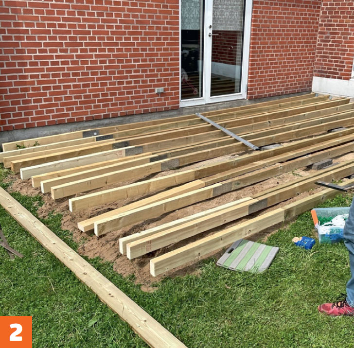 Legg en bjelke langs husveggen, og kloss den opp til ønsket høyde. Skru den fast til veggen med karmskruer. Legg deretter ut resten av bjelkene.