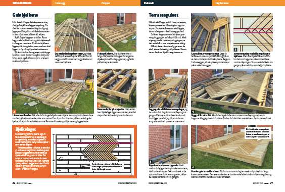 Sammenføyningen skal ligge på begge bjelkene. Men hver bjelke bærer kun det bordet som begynner på samme side av sammenføyningen. Skruene skal sitte to om gangen på en rett linje som følger bjelkene.