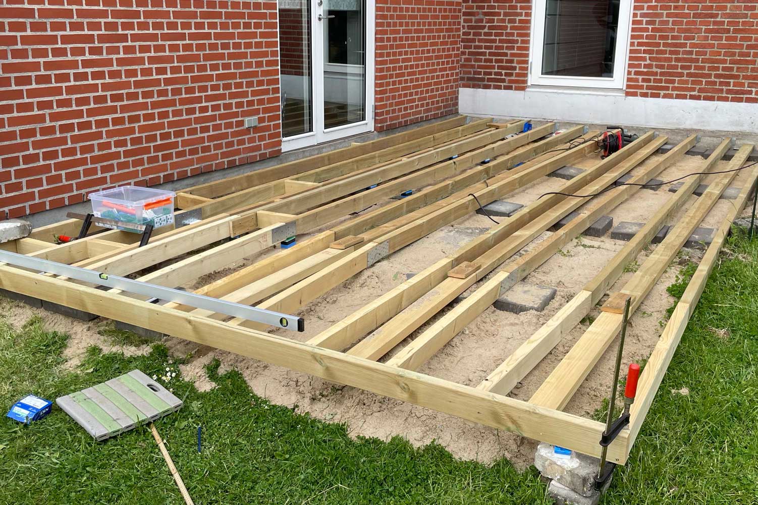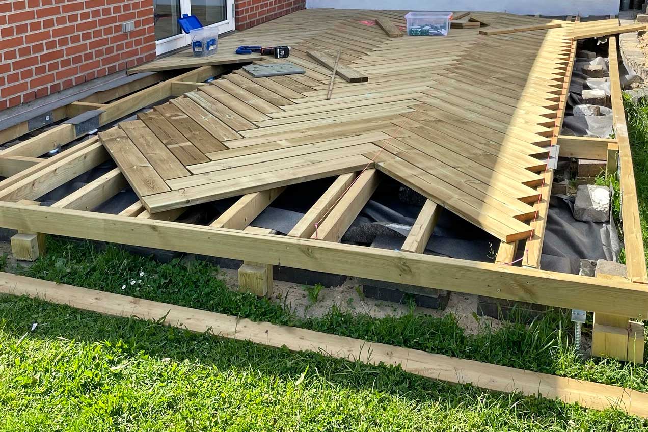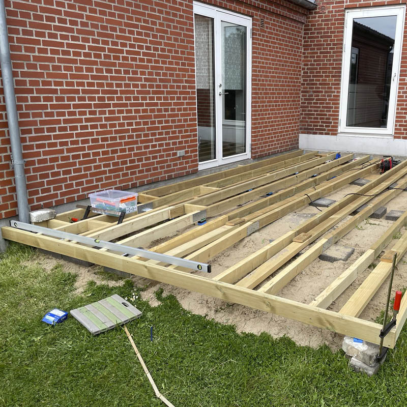 Terrassen legges på betongheller og kiler. Selv om underlaget er jevnet ut, skal skjelettet stå på heller og klosses opp med kiler, slik at overflaten blir helt plan.