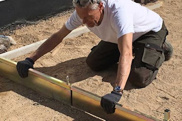 Det 3i det gamle avrettingslaget med ny grus, som vi stamper. Så legger vi ut betongheller på det nynivellerte avrettingslaget.
