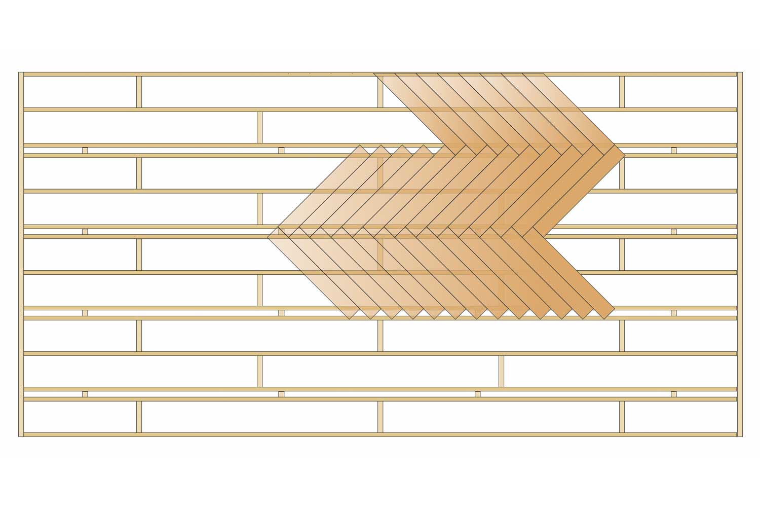 Når det skal lages fiskebeinsmønster, skal gulvbjelkene legges nøyaktig. De skal ha samme avstand fag for fag og ligge parallelt; ellers vil fiskebeinsmønsteret sakte men sikkert bli skjevt.