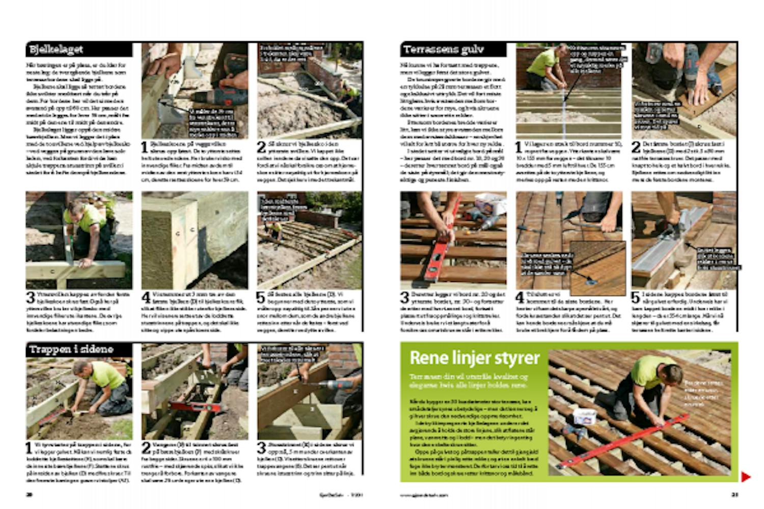 Det nederste trinnet skrus på, og et nytt stusstrinn stenger ned mot plenen. I enden av terrassen, der bakken stiger, og der vi bare har ett trinn, skjæres det nederste stusstrinnet til slik at det passer.