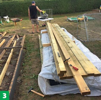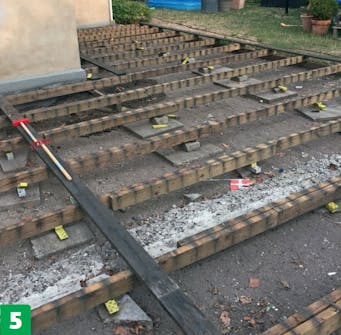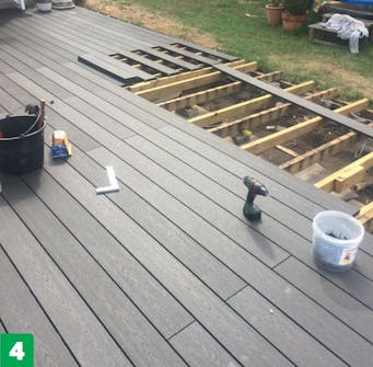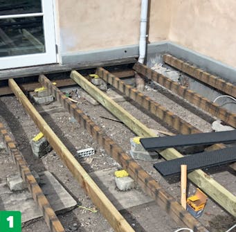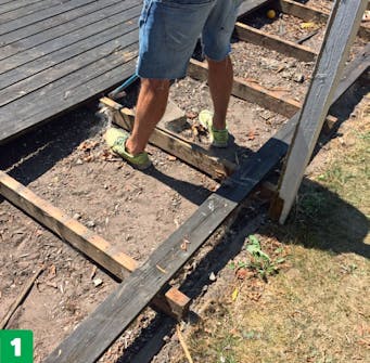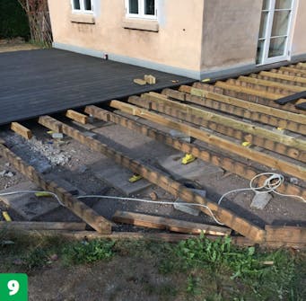 Vi begynner selvfølgelig med å fjerne de gamle terrassebordene. Vi er forsiktige, for tilfarerne skal nemlig brukes igjen. Men avstanden mellom de eksisterende tilfarerne er for stor, og det var svikt i det gamle gulvet. Dette problemet løser vi ved å legge flere tilfarere.