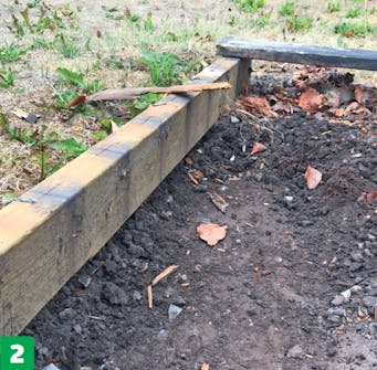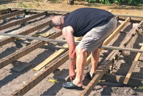 Vi nærmer oss enden. Snart er vi ute ved kanten av terrassen ved plenen. På enden av tilfarerne monteres det et dekkbord for å lage en pen avslutning på terrassen.
