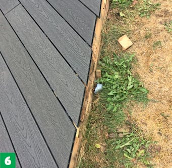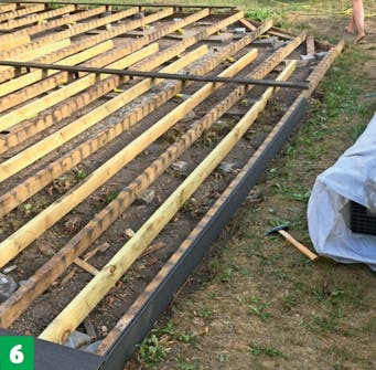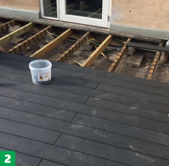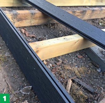 Sett fast et endebord. For å holde styr på terrassen mens vi monterer bordene, skrur vi fast et bord på enden av tilfarerne. Når terrassebordene er lagt, blir endebordet montert helt nøyaktig.