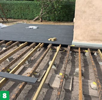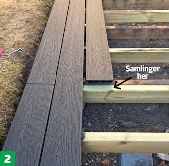 Nå skal vi legge bord på den lange delen av terrassen. Bordene rekker ikke fra den ene enden til den andre. Derfor skal de skjøtes etter samme metode som på den første delen. Igjen er det lagt doble tilfarere der bordene skjøtes.
