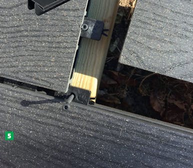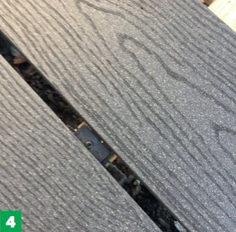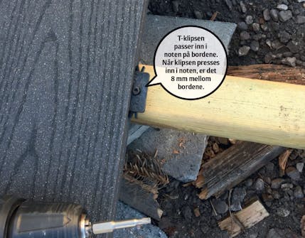 Monteringen skal være skjult. Derfor bruker vi T-klips, som passer i den freste noten i terrassebordene. Det ytterste bordet lengst mot kanten må dog skrus fast på vanlig vis, men deretter brukes det bare T-klips.