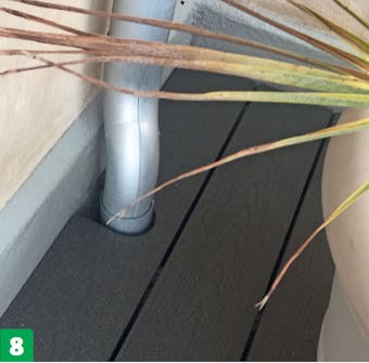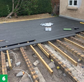 Så er vi kommet til hjørnet. Vi har lagt terrassebord helt til kanten av hjørnet. I den lange retningen legger vi også terrassebordene med forskjøvede skjøter.