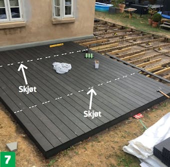 Skjøtene er videreført fra den korte delen. Terrassen er så lang, at det blir mange skjøter i bordene. Vi får dem til å fremstå mest mulig harmonisk.