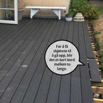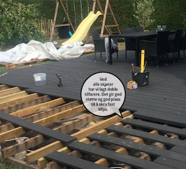 - Terrassebord i kompositt. Det finnes mange forskjellinge typer. Disse er 23 x 146 mm, og vi har brukt 378 meter