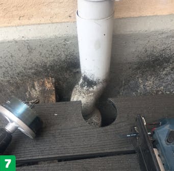 Et bord tilpasses rundt et nedløpsrør. Vi bruker en stikksag og en hullsag til bormaskinen for å tilpasse bordet.
