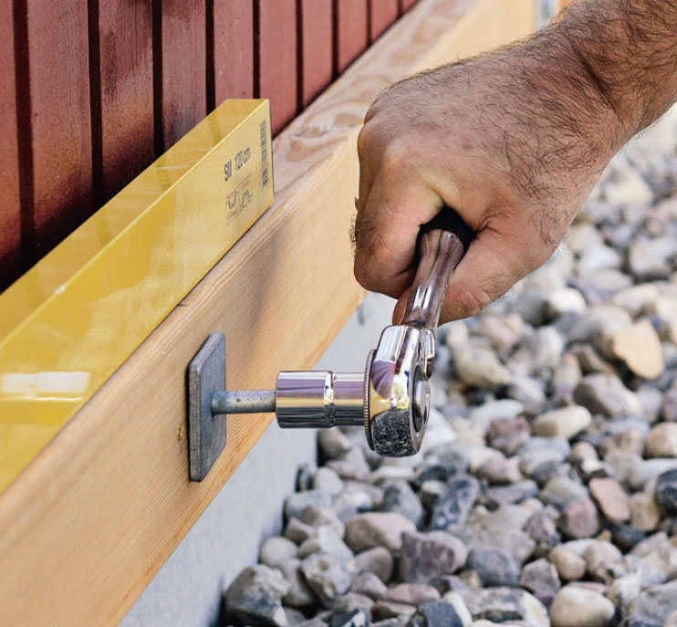 Bjelken skrus fast til bunnsvilla på huset med franske skruer for hver 80 centimeter. Her bruker vi 8 x 150 mm skruer med skiver under.