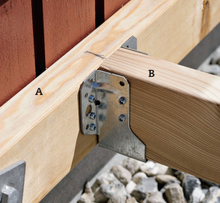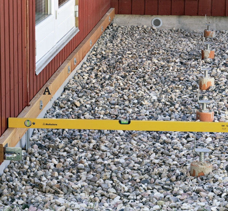 Plassér en bjelke (A) mot veggen slik at overkanten er 11 cm fra underkanten på dørterskelen. Det tilsvarer tykkelsen av to terrassebord pluss fem centimeter luft opp til trinnet. Bor opp med spiralbor til skruene til bjelken.