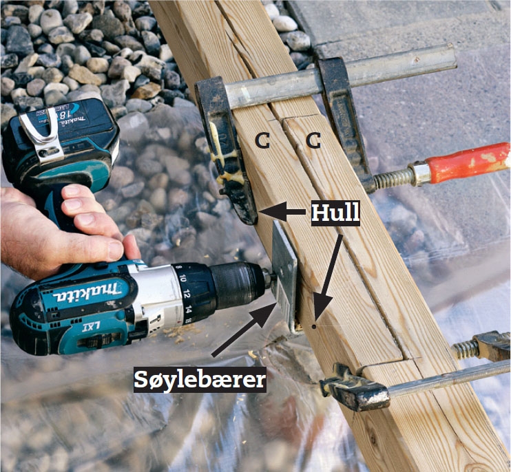 Montér bærebjelken (C) midlertidig med skrutvinger. Plassér skjøten i søyleskoen, og bor gjennom de to hullene i beslaget og stolpen med et Ø 8 mm bor. Bor ytterligere et hull på hver side av beslaget midt på siden av bjelken.