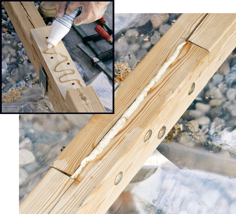 Sammenføyningen får PU-lim før den spennes sammen.