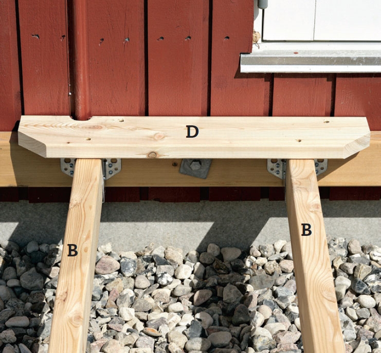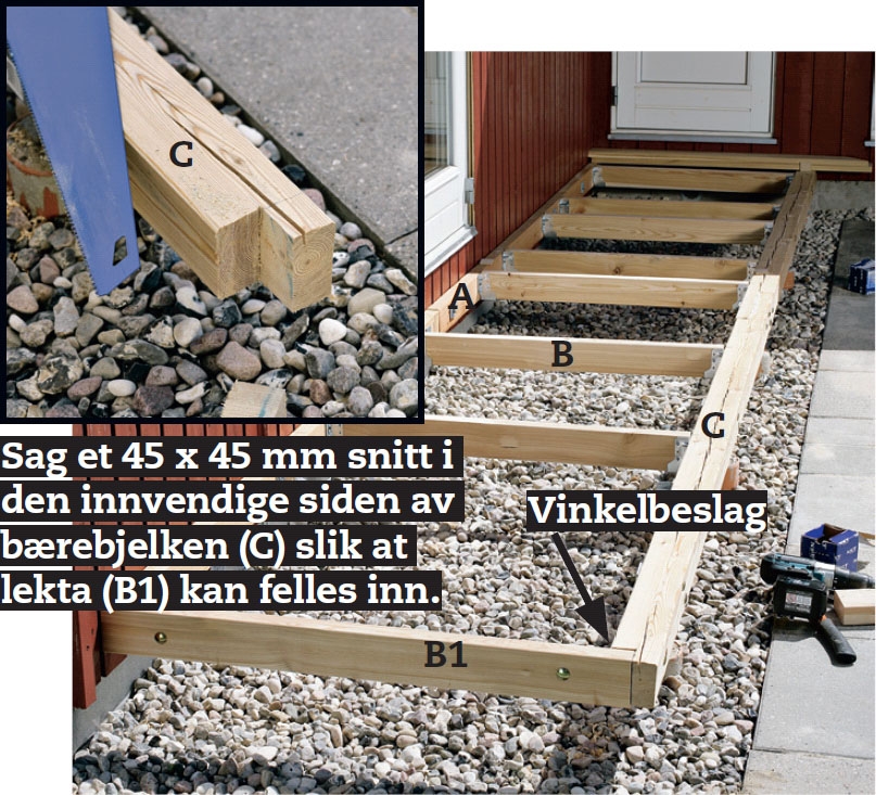 Vi begynner med å lage ei solid ramme som kan bære terrassen. Fordi vi har valgt å lage terrassen i lerk, har vi et problem med den lange bærebjelken (C) fordi lerk har en tendens til å vri seg. Det er lettere å skaffe to korte, rette bjelker på 3 meter enn en lang på 6.