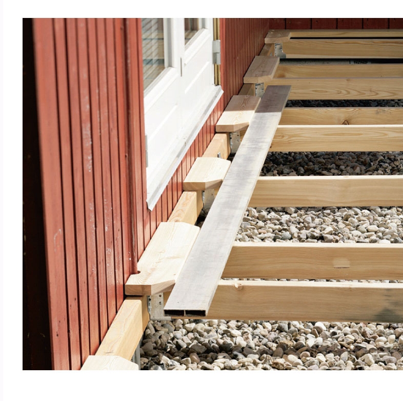 Før vi kan sette fast lemmene, bør det plasseres et gjennomgående terrassebord (E) langs veggen i hele terrassens lengde og den ene enden. Bordet skal brukes til å feste hengslene på, og det skal sikre at feltene står litt skrått inn mot huset slik at de ikke faller ned med et brak. Før bordet kan skrus på, må det klosses opp slik at det kommer i nivå med spikerslagene på lemmene.