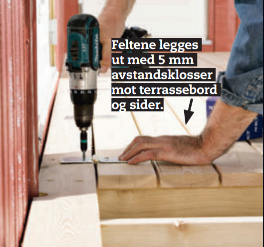 Legg terrassebordene (G) på et plant arbeidsbord. Hold avstanden mellom bordene med 5 mm avstands-klosser. Endene på bordene skal legges i flukt, og spikerslagene (F) skrur du fast med 4,5 x 50 mm A4-skruer.
