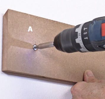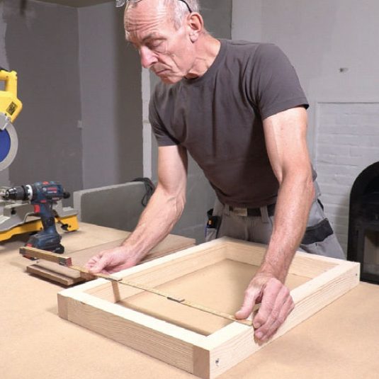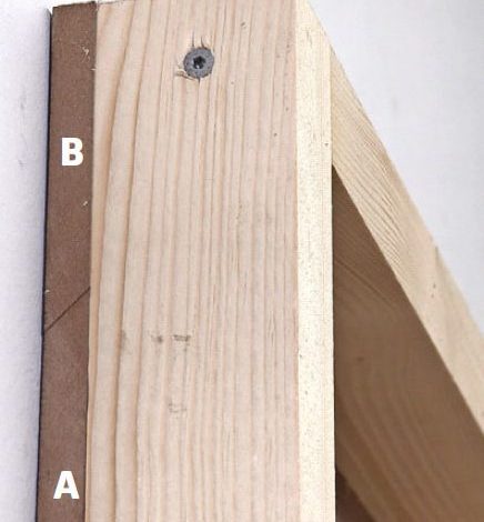 Skjær til en 18 mm MDF-plate, slik at den passer bak på emnet. Splitt den deretter med et 45 graders snitt på langs, slik at du får to lister som passer sammen.