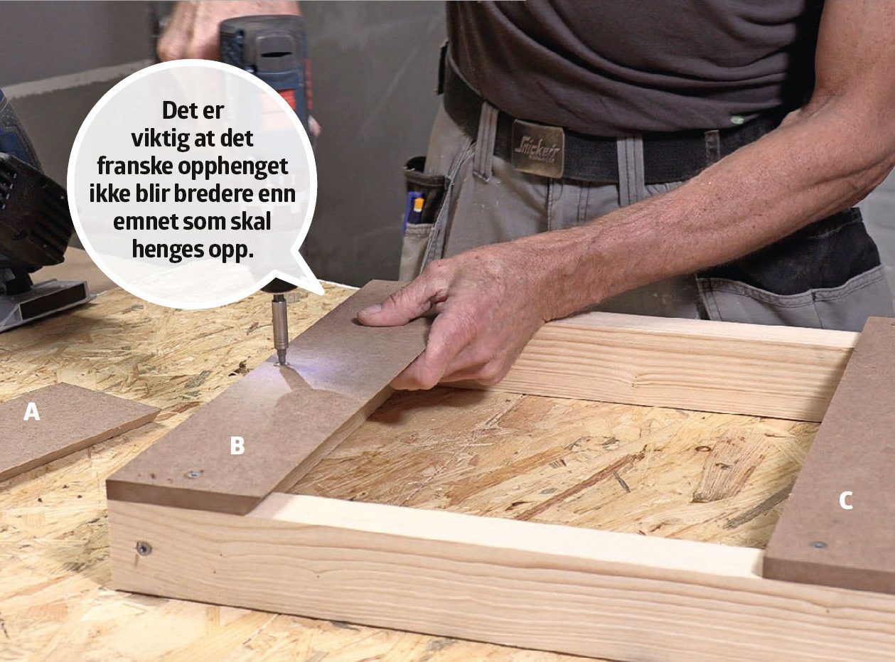 Skru fast den ene av de skråskårede listene (B) i emnet, og sørg for at den vender riktig vei. Dermed kan den hektes utenpå den andre listen (A), som skrus fast i veggen. Ved å skru fast en list i samme tykkelse (C) i bunnen av emnet får vi jevn avstand til veggen.