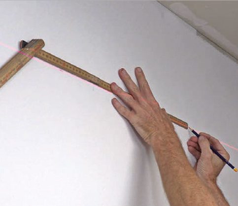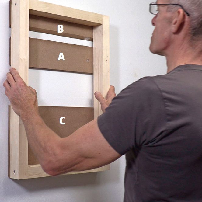 Heng opp emnet på veggen, slik at den ene listen (A) går i hakk med den andre (B). Den tredje listen (C) sørger for at bunnen av emnet ikke søker inn mot veggen.