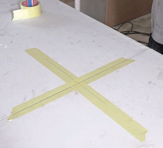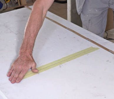 Finn halvparten av bordets lengde, og sett en bit maskeringsteip på tvers av bordet. Mål etter igjen, og marker halvparten av bordets lengde med en blyantstrek på maskeringsteipen.