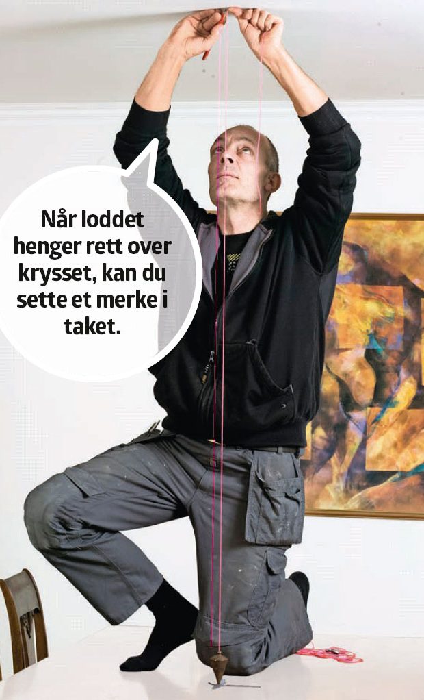 Gjenta prosessen, men denne gangen med bredden av bordet. Sett en blyantstrek, slik at du får et kryss. Nå vet du hvor bordets sentrum er, og dermed hvor sentrum av lampen bør henge.