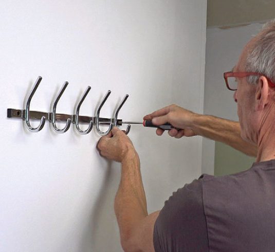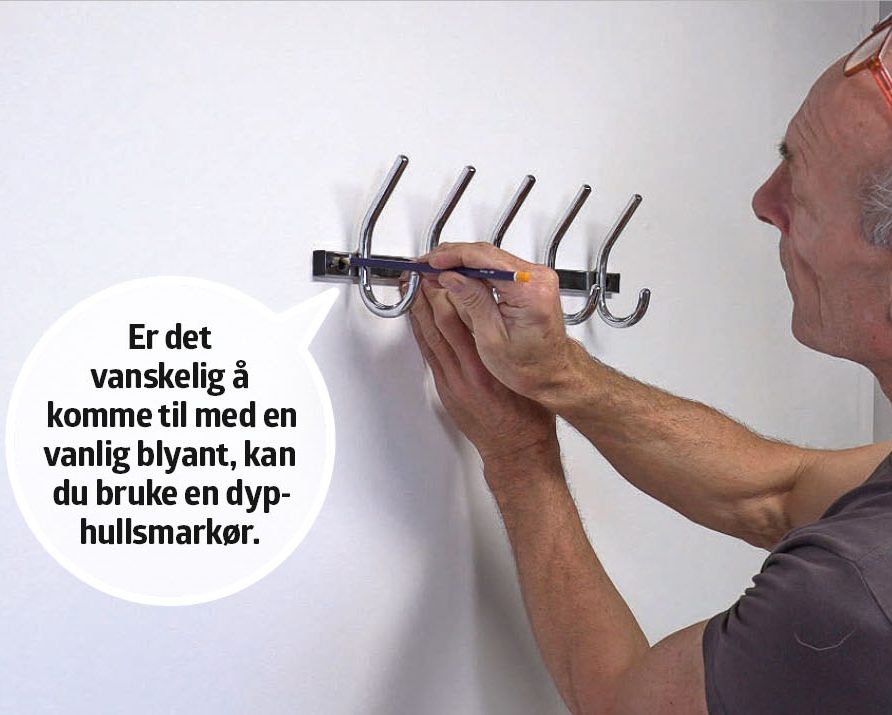 Skal du for eksempel henge opp en knaggrekke som krever mer enn en skrue, er trikset å montere den ene skruen, bringe knaggrekken i vater og markere hvor det andre hullet skal være. Deretter er det bare å bore et hull og montere plugg og skrue.
