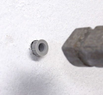 Monter en 8 mm plugg i hullet, og slå den forsiktig på plass med en hammer. Ettersom veggen vår består av to lag gips, velger vi gipsplugger til formålet.