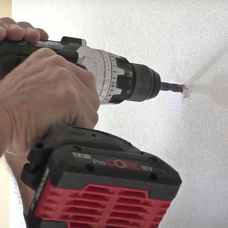 Bor et hull i gipsveggen med et murbor som passer til diameteren på gipsrosetten. Vi bruker en Ø 10 gipsrosett, men mindre rosetter kan også brukes.