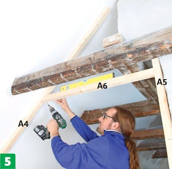 Fortsett opp på veggene i begge sider. Først setter vi lekten på skråveggen (A4) i forlengelse av lekten på kneloftet. Deretter setter vi lekten (A5) på veggen ovenfor.