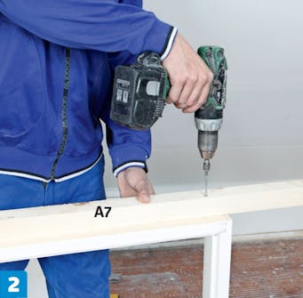 Dørkarmen skrus sammen. Husk å forbore til skruene i bunnstykket, som er av hardt, tynt treverk, som fort kan sprekke.