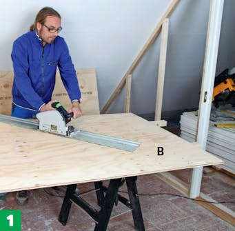Kryssfinérplatene (B) skjæres til. Det er lettest med en dykksag med skinne. Legg platen på et par lekter, som det ikke gjør noe om du sager litt ned i. Da ligger begge delene godt understøttet når du sager.