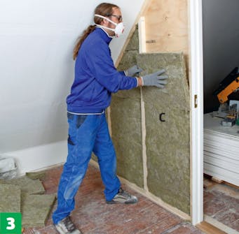 Press mineralullsmatter (C) inn mellom stolpene. Bredden passer, og de skjæres til i lengden, slik at de er 4-6 mm for store og sitter tett ut til lektene i alle sider. Har du en isolasjonskniv, kutter du mattene enkelt.