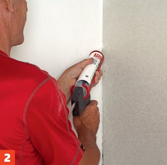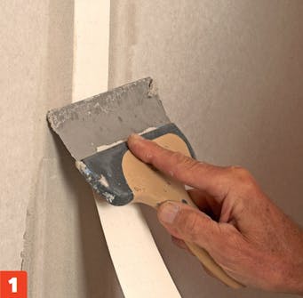 Legg et tynt lag sparkelmasse i en skjøt mellom to plater. Trykk fast papirstrimmelen i sparkelmassen med en sparkel. Dekk strimmelen med et nytt lag sparkelmasse, og trekk av med et lett trykk.