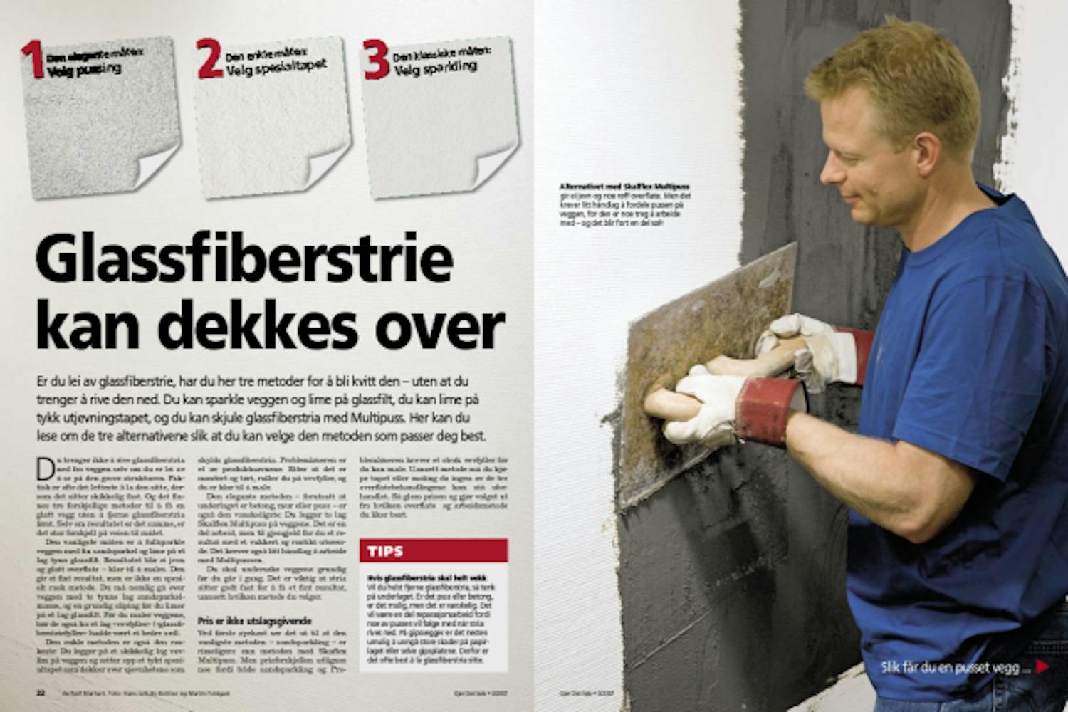 Sitter den gamle glassfiberstria skikkelig fast, et det lettest å la den sitte og sand sparkle oppå. Det er nemlig forholdsvis enkelt å fullspar-kle en vegg, som du kan få helt glatt og jevn med sandsparkel masse.