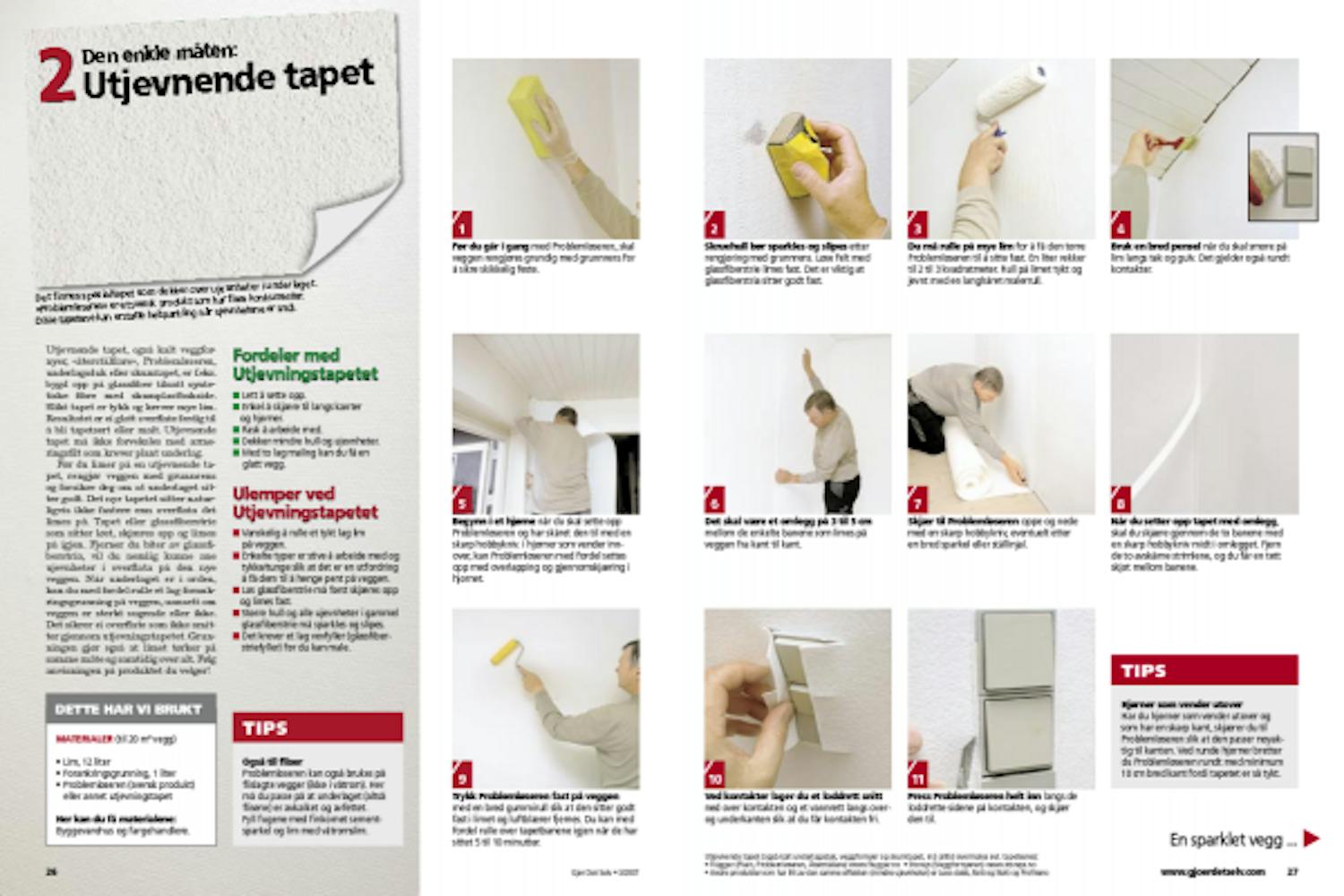 Før du limer på en utjevnende ta-pet, rengjør veggen med grunnrens og forsikre deg om at underlaget sitter godt. Det nye tapetet sitter naturligvis ikke fastere enn overflata det limes på. Tapet eller glassfiberstrie som sitter løst, skjæres opp og limes på igjen. Fjerner du biter av glassfiberstria, vil du nemlig kunne ane ujevnheter i overflata på den nye veggen. Når underlaget er i orden, kan du med fordel rulle et lag forankringsgrunning på veggen, uansett om veggen er sterkt sugende eller ikke. Det sikrer ei overflate som ikke smitter gjennom utjevningstapetet. Grunningen gjør også at limet tørker på samme måte og samtidig over alt. Følg anvisningen på produktet du velger!
