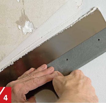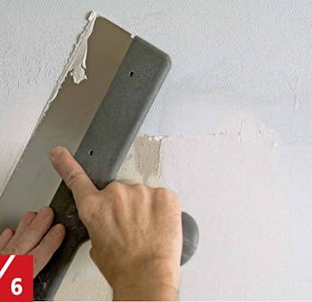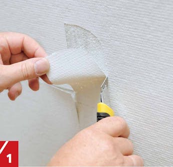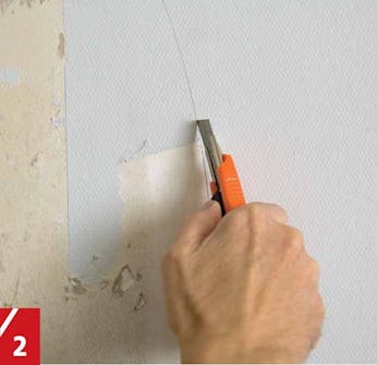 Et større område sitter løst. Det skjæres opp med en hobbykniv inn til fast vegg og fjernes. Bruk en sparkel til å dra av den løse glassfiberstria med.