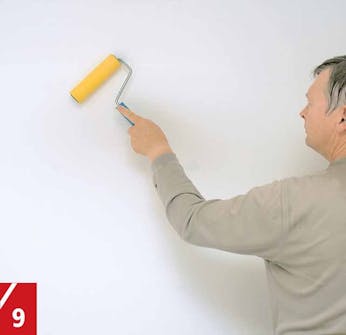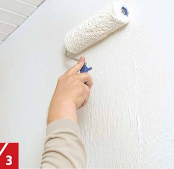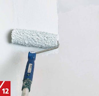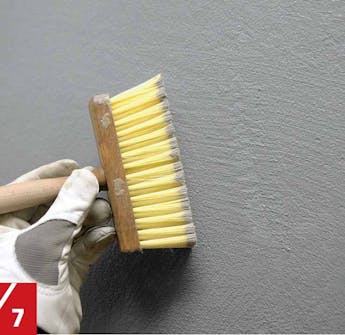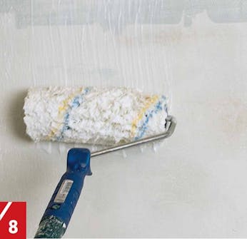 Sandsparkelmassen grunnes med pussog murgrunning for å gi ei ensartet overflate. Rull grunningen på veggen - stryk med pensel i hjørner og ved kanter.