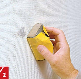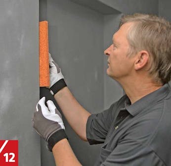 Slip glassfiberstriekantene i overgangen til underlaget. Slip også området der stria er skrapt av. Veggen skal være plan, for selv de minste ujevnheter kan ses på en sand-sparklet vegg. Når underlaget er i orden, skal du rengjøre veggen med grunnrens.